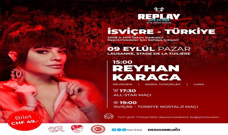 Depremzedeler için düzenlenecek yardım organizasyonunda İsviçre ile Türkiye nostalji dostluk maçında 9 Eylül’de karşı karşıya gelecek. Unutulmaz maçta olduğu gibi Fatih Terim’in önderliğinde Arda Turan, Nihat Kahveci, Volkan Demirel, Emre Belözoğlu, Tuncay Şanlı, Servet Çetin, Hamit Altıntop gibi oyuncular forma giyecek.