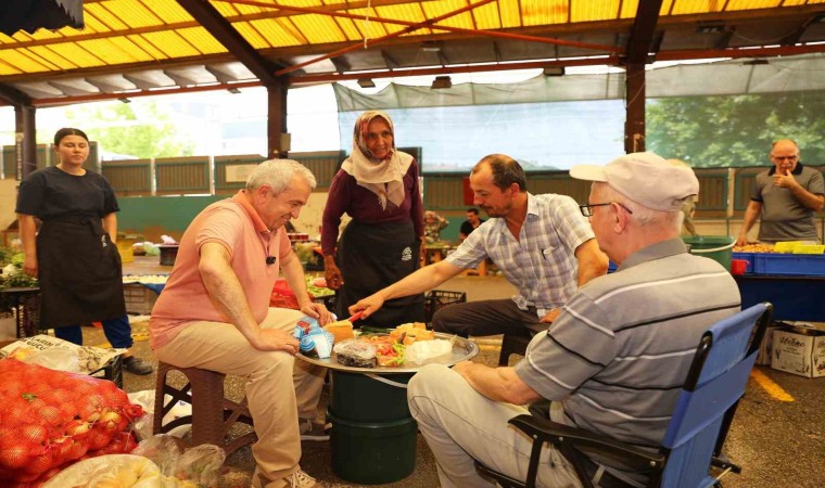 Başkan Şadi Özdemir, ziyaretinde pazarcı esnafının kurduğu sofraya da konuk olarak onlarla bir süre sohbet etti.