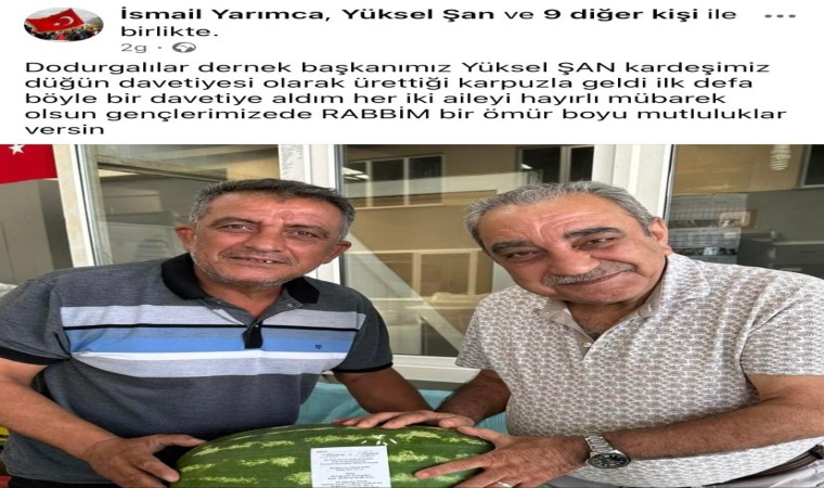 Bin bir emekle ürettiği karpuzları düşük fiyat nedeniyle tarlada kalmasına da vicdanının el vermediğini dikkat çeken Yüksel Şan, “ Dört dönümde çok güzel karpuz yetiştirdim. Aylarca uğraşıp yetiştirdiğim karpuzun tarlada kalmasını istemedim. Bende karpuzları dünya evine girecek kızımın düğünü için davetiye olarak verdim. Düğün davetiyesindeki bilgileri etiket üzerine bastırdım. Ürettiğim karpuzların üzerine düğün davetiyesi etiketini yapıştırarak dağıtmaya başladım. Karpuzdan düğün davetiyesi çok fazla ilgi gördü” diye konuştu.