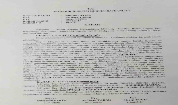 Nevşehir’in Ürgüp ilçesinde 31 Mart’ta yapılan mahalli idareler seçimleri, MHP’nin itirazı üzerine iptal edildi. Ürgüp ilçesinde Mahalli İdareler Genel Seçimlerinin tekrarlanması kararlaştırıldı.