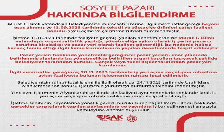 Uşak Belediyesi’nden yapılan açıklamada; "Murat T. isimli vatandaşın Belediyemize müracaatı üzerine, ilgili mevzuatlar gereği beyanı esas alınmış ve 13 Eylül 2023 tarihinde tekstil ve züccaciye ürünleri satışı faaliyet konulu iş yeri açma ve çalıştırma ruhsatı düzenlenmiştir. İşletme 11 Kasım 2023 tarihinde faaliyete geçmiş, yapılan denetimlerde ise Murat T. isimli vatandaşın organizatörlük yaptığı, yönetmeliğe aykırı olarak iş yerini pazarcı esnafına kiraladığı ve pazar yeri olarak faaliyet gösterdiği, bu nedenle haksız kazanç temin ettiği ilgili kamu kurumlarınca yapılan denetimlerde tespit edilmiştir. Pazar yerleri hakkında yönetmelik gereğince; pazar yerleri, imar planında belirlenmiş alanlarda bu yönetmelikte belirtilen asgari koşulları taşıyacak şekilde belediyeler tarafından kurulur. Gerçek veya tüzel kişiler tarafından pazar yeri kurulamaz. İlgili mevzuatlar gereğince 20 Kasım 2023 tarihinde iş yeri açma ve çalışma ruhsatına aykırı faaliyette bulunan işletmenin ruhsatı iptal edilmiştir. Belediyemizin ruhsat iptal işlemi ile ilgili olarak da 24 Kasım 2023 tarihinde Uşak İdare Mahkemesi; söz konusu işletmenin yürütmeyi durdurma talebini reddetmiştir. Yine aynı işletmenin Afyonkarahisar ilinde de faaliyeti aynı nedenlerle sonlandırılarak iş yeri açma ve çalışma ruhsatı mahkeme kararı ile iptal edilmiştir. İşletme sahibinin beyanlarına yönelik gerekli hukuki süreç başlatılmıştır. Konu hakkında gerçekler çarpıtılarak yapılan paylaşımlara ve yayınlara itibar edilmemesi amacıyla kamuoyuna önemle duyurulur" ifadeleri kullanıldı.