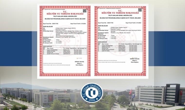 Bu önemli gelişmelerin bir sonucu olarak, Kültür ve Turizm Bakanlığı, Uşak Üniversitesi’nin Entegre Kalite Yönetim Sistemi ve Entegre Anket Yönetim Yazılımını tescilleyerek, Uşak Üniversitesinin kalite yönetiminde gösterdiği mükemmeliyetin resmen tanındığını ortaya koydu. Bu tescil, Uşak Üniversitesinin eğitimde ve yönetim süreçlerinde ileriye dönük sürdürülebilir başarı hedeflerine ulaşma yolunda önemli bir kilometre taşı olarak nitelendirildi. Uşak Üniversitesi, bu başarıyı, bilgi teknolojilerindeki inovatif yaklaşımlarını, güçlü akademik altyapısını ve sürdürülebilir kalite yönetimi anlayışını birleştirerek elde etti.