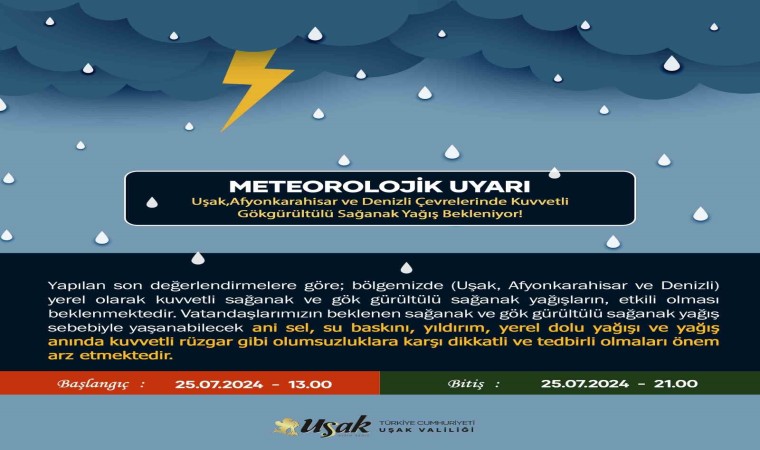 Uşak Valiliği tarafından yayımlanan uyarıda “Yapılan son değerlendirmelere göre, bölgemizde yer alan Uşak, Afyonkarahisar ve Denizli illerinde yerel olarak kuvvetli sağanak ve gök gürültülü sağanak yağışların, etkili olması beklenmektedir. Vatandaşlarımızın beklenen sağanak ve gök gürültülü sağanak yağış sebebiyle yaşanabilecek ani sel, su baskını, yıldırım, yerel dolu yağışı ve yağış anında kuvvetli rüzgar gibi olumsuzluklara karşı dikkatli ve tedbirli olmaları önem arz etmektedir” ifadeleri kullanıldı.