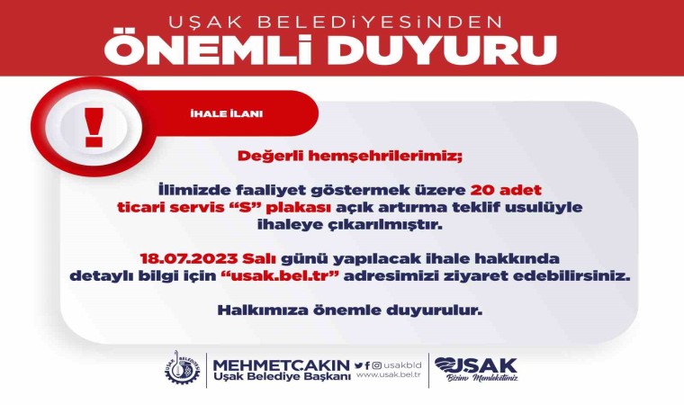 UŞAK BELEDİYESİ SOSYAL MEDYA HESABINDAN YAPTIĞI PAYLAŞIMLA UŞAK’TA FAALİYET GÖSTEREN 20 TİCARİ SERVİS PLAKASININ İHALESİNİN BAŞLATILDIĞINI DUYURDU.