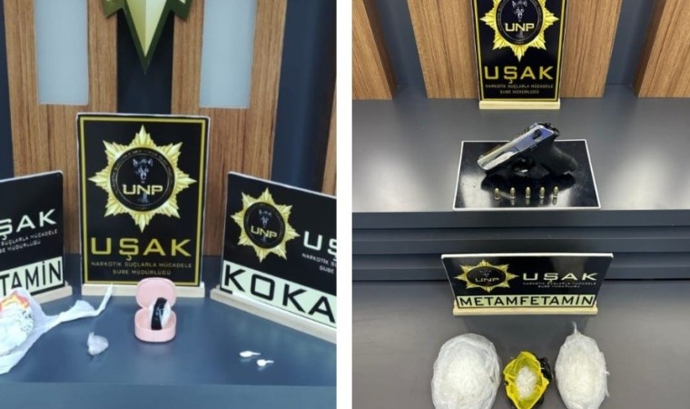 Uşak’ta 354 gram Metamfetamin, 4 adet Sentetik Ecza, 1 gram Bonzai, 0,6 gram Kokain, 2 adet Hassas Terazi, 1 adet ruhsatsız tabanca, 5 adet fişek ile yakalanan 10 şüpheli yakalandı.