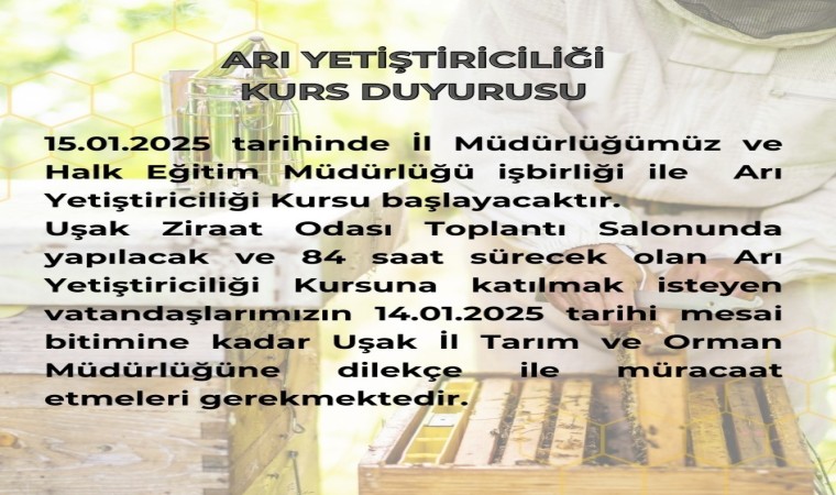 Uşak İl Tarım ve Orman Müdürlüğü ve Halk Eğitimi Merkezi ile iş birliği içinde 15 Ocak tarihinde başlayacak olup ve 84 saat sürecek olan Arı Yetiştiriciliği kursu açılacağını duyurdu. İl Tarım ve Orman Müdürlüğü’nce sosyal medya üzerinden yaptığı paylaşımda ise “15 Ocak 2025 tarihinde İl Müdürlüğümüz ve Halk Eğitim Müdürlüğü işbirliği ile Ari Yetiştiriciliği Kursu başlayacaktır. Uşak Ziraat Odası Toplantı Salonunda yapılacak ve 84 saat sürecek olan Ari Yetiştiriciliği Kursuna katılmak isteyen vatandaşlarımızın 14 Ocak 2025 tarihi mesai bitimine kadar Uşak İl Tarım ve Orman Müdürlüğüne dilekçe ile müracaat etmeleri gerekmektedir.” ifadeleri kullanıldı.