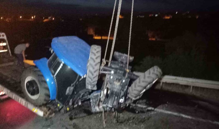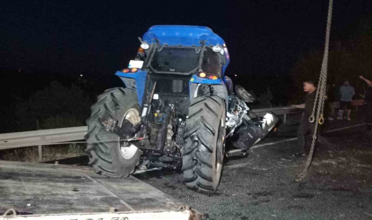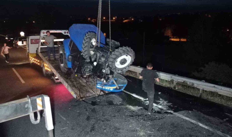 Çarpışmanın etkisiyle savrularak yol kenarında ki bariyerlere çarpan traktör ikiye bölündü.