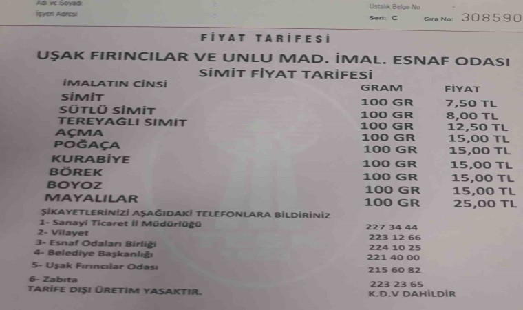 Uşak’ta 100 gram simit 7,5 TL, 100 gram sütlü simit 8 TL, 100 gram tereyağlı simit 12,50 TL, Açma 100 gram 15 TL, poğaça 100 gram 15 TL, kurabiye 100 gram 15 TL, börek 100 gram 15 TL boyoz 100 gram 15 TL ve mayalılar 100 gram 25 TL gibi fiyatlardan satılmaya başlandı.