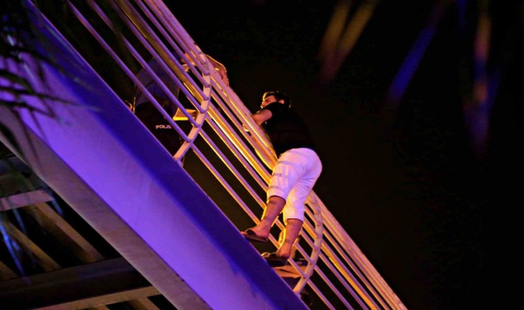Antalya’da ailevi nedenlerden ötürü bunalıma giren bir genç, araç trafiğinin en yoğun olduğu Gazi Bulvarı’nda bulunan üst geçide çıktı. Polis ekiplerinin bir anlık dalgınlığından faydalanarak yakaladığı şahıs, kelepçelenerek polis merkezine götürüldü.