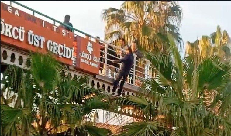 Antalya’nın Serik ilçesinde iddiaya göre kız arkadaşından ayrılan genç, çıktığı üst geçitte kendini aşağıya sarkıttı. Yürekleri ağza getiren olay anı vatandaşlar tarafından cep telefonu ile kaydedildi.