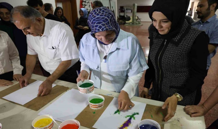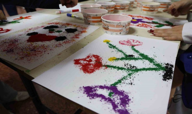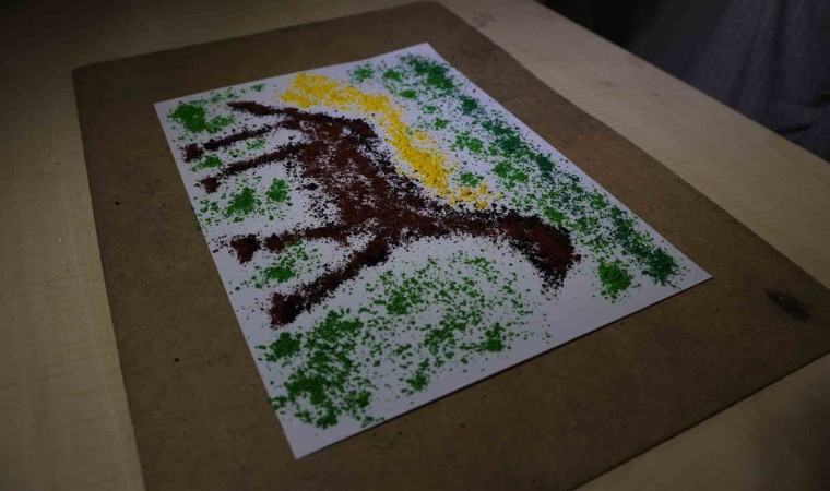 Resim Öğretmenliği 1. sınıf öğrencisi Ahsen Azra Kara, “Proje çerçevesinde burada farklı tekniklerle arkadaşlarımıza yardımcı oluyoruz. Ütü ile pastel boya tekniğini, diğer tarafta da kum sanatı tekniğini kullanarak resim yapıyoruz. bu daha çok depremzede arkadaşlarımızı rehabilite etmek amaçlı yapılan bir projeydi. Herkesi de işin içerisine katmaya çalıştık. Sadece kalemle değil farklı teknikler de kullanarak herkes her şeyi yapabilir, diye düşünüyoruz” şeklinde konuştu.