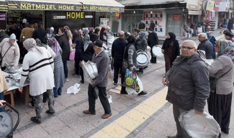 Yaklaşık bine yakın alüminyum leğen, tepsi ve tavanın yarım saat içinde tükendiğini belirten mağaza sahibi Kadir Orhan, "Çiğ köfte leğeninin piyasa değeri 155, 165, 180 lira arasında değişirken, biz 100 liraya satışa sunduk. Bundan dolayı da yoğun ilgi gördük. Ürünlerimi açmakta güçlük yaşadım, zorlukla müşterilerin arasından sıyrılmaya çalıştım" dedi.