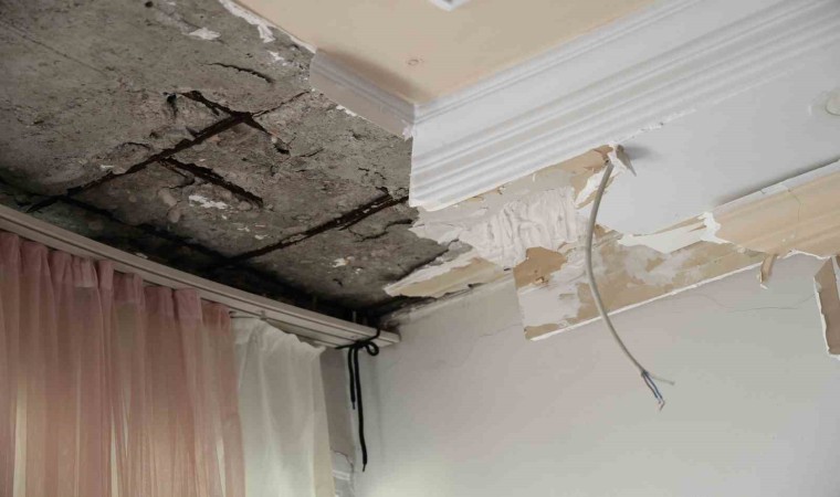 Adana’da şiddetli yağmur nedeniyle bir evin tavan alçısı koparak yere düştü. 5 çocuğuyla birlikte alçının düştüğü odada uyuyan genç kadın, “Deprem oldu sandık. Çok korktuk” dedi.