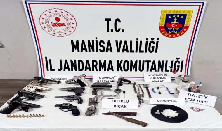 Manisa İl Jandarma Komutanlığı KOM Şube Müdürlüğü ve Yunusemre İlçe Jandarma Komutanlığı ekiplerince uyuşturucu maddeyle mücadeleye yönelik icra edilen operasyonda, M.A isimli şahsın ev ve iş yerinde yapılan aramada; 8 adet ruhsatsız tabanca, 8 adet fişek, 2 adet tabanca gövdesi, 10 adet tabanca namlusu, 10 gram metamfetamin, 10 adet uyuşturucu madde kullanma aparatı, 3 adet sentetik hap ele geçirildi. Bahse konu şahıs gözaltına alınırken, olayla ilgili soruşturma sürüyor.