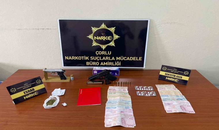 Tekirdağ İl Emniyet Müdürlüğü Narkotik Suçlarla Mücadele Şube ekiplerince Çorlu ilçesi Hıdırağa Mahallesi’nde uyuşturucu ve uyarıcı madde ticareti yapan şahıslara yönelik operasyon düzenlendi. Yapılan çalışmada 10 adres ve 10 şahsın üzerinde yapılan aramalarda 10.96 gram esrar, 2 tablet halinde 28 adeti sentetik ecza hap, 1 adet ruhsatsız tabanca, 2 adet şarjör, 8 adet 9x19 fişek, 1 adet kurusıkı tabanca, 1 adet av tüfeği kartuşu, uyuşturucu madde fişeklenmesinde kullanılan malzemeler, uyşturucu madde ticaretinde elde edildiği değerlendirilen 8 bin 495 TL para ele geçirildi.