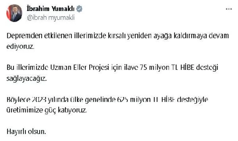 Tarım ve Orman Bakanı İbrahim Yumaklı, Twitter hesabından yaptığı açıklamada, "Depremden etkilenen illerimizde kırsalı yeniden ayağa kaldırmaya devam ediyoruz. Bu illerimizde 'Uzman Eller Projesi' için ilave 75 milyon TL hibe desteği sağlıyoruz. Böylece 2023 yılında ülke genelinde toplam 625 milyon TL hibe desteğiyle üretimimize güç katıyoruz" dedi. (DHA)