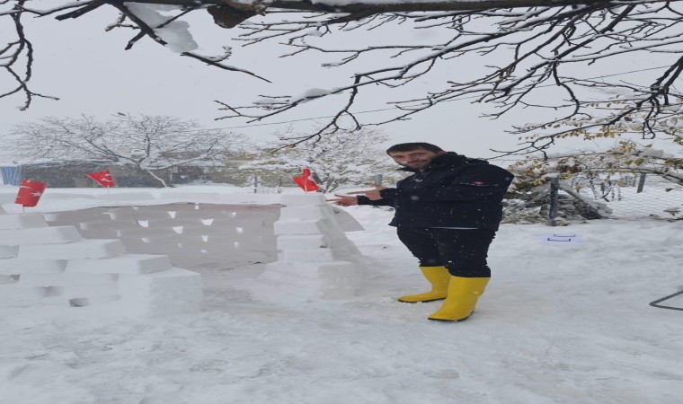 İbrahim Turan, çağ kebabının ardından kardan bir ev inşa ederek, karın güzel fikirlerle keyifli hale dönüştürülebileceğini gösterdi.