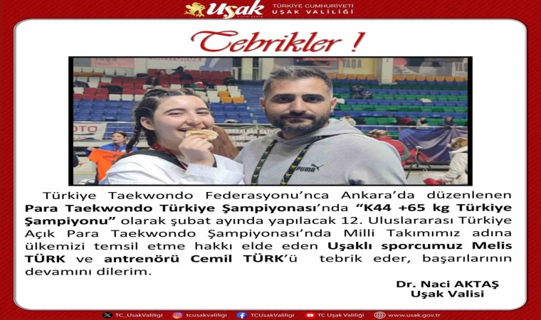 Uşak Valisi Naci Aktaş, Para Taekwondo Türkiye Şampiyonası’nda Türkiye şampiyonu olan ve Milli Takım adına Türkiye’yi temsil edecek Uşaklı sporcuya ve antrenörüne tebrik mesajı yayımladı.