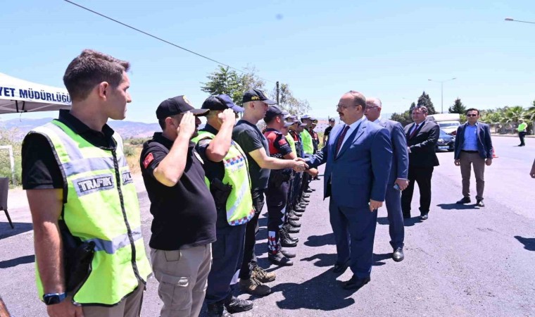 Aydın Valisi Yakup Canbolat, Hayvanpazarı Uygulama Noktasında durdurulan araç sürücüleriyle bayramlaştı. Vali Canbolat, sürücülere trafik kurallarına uymaları ve aşırı hız yapmamaları konusunda uyardı.