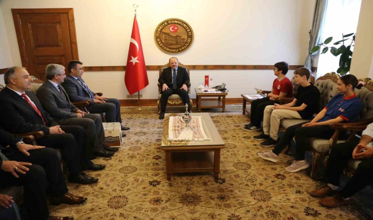 Kastamonu Valisi Meftun Dallı, Liselere Geçiş Sistemi sınavında tam 500 puan alarak Türkiye birincisi olan 3 öğrenciyi kabul etti. Öğrencilere hediyeler takdim eden Vali Dallı, başarıları için tebrik etti.