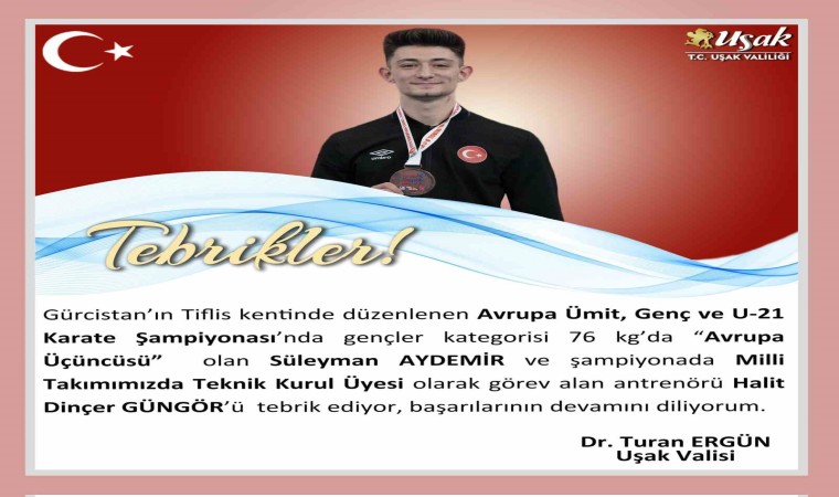 Uşak Valisi Turan Ergün dereceye giren Uşaklı sporcu ve antrenörü için mesaj yayımladı. Vali Ergün yayımlamış olduğu mesajda “Gürcistan’ın Tiflis kentinde düzenlenen Avrupa Ümit, Genç ve U-21 Karate Şampiyonası’nda gençler kategorisi 76 kg’da ‘Avrupa Üçüncüsü’ olan Süleyman Aydemir ve şampiyonada Milli Takımımızda Teknik Kurul Üyesi olarak görev alan antrenörü Halit Dinçer Güngör’ü tebrik ediyor, başarılarının devamını diliyorum.” ifadelerini kullandı.