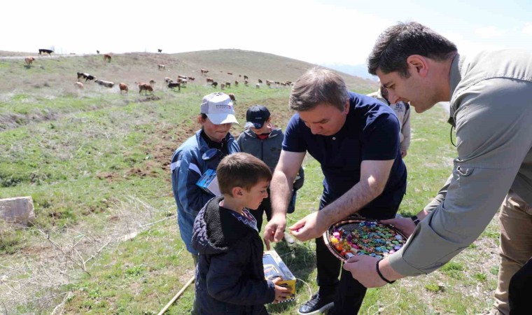 Erzincan’ın Otlukbeli ilçesine giderken yolda büyükbaş hayvan sürüsü otaran çocukları gören Vali Hamza Aydoğdu, aracını durdurarak çocuklarla hemhal oldu. Vali ile çocukların şeker tadında karşılaşmaları yürekleri ısıttı.