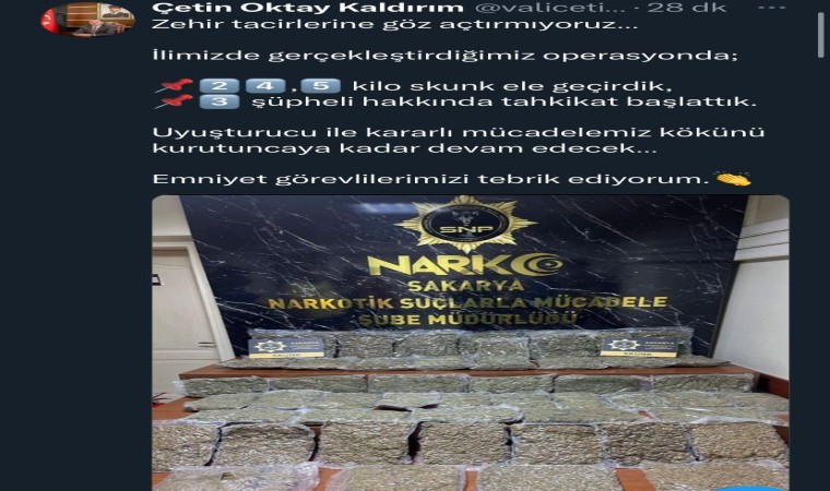 Sakarya’da polis ekiplerince gerçekleştirilen uyuşturucu operasyonunda 24.5 kilo skunk uyuşturucu maddesi ele geçirildi. 3 şüpheli hakkında tahkikat başlatılan operasyonu Sakarya Valisi Çetin Oktay Kaldırım sosyal medya hesabından duyurdu.