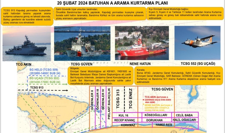 Arama çalışmalarına Türk Silahlı Kuvvetlerinin (TSK) Sualtı Savunma (SAS) komandolarından 4 dalgıç destek veriyor. Toplam 30 dalgıç bölgede arama kurtarma çalışmaları gerçekleştiriyor. Karacabey ve Balıkesir’in Bandırma ilçelerinde limanlarda bulunan yaklaşık 13 balıkçı teknesi kendilerine belirlenen bölgede kıyıdan 3,5 mil açıkta arama-tarama çalışmaları yaparak destek veriyor. TCG Akın gemisinin ise kıyıdan yaklaşık 5.5 mil açıklıkta faaliyet yürüttüğü öğrenildi. İl Jandarma Komutanlığına bağlı timler sahil kesimlerinde yaya olarak arama çalışmaları yapıyor.