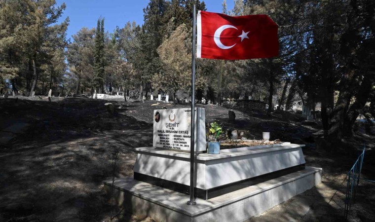 Gördes-Salihli yangınında tamamen yanan Karayakup Mahallesinde şehit kabri ve Türk Bayrağı alevlere teslim olmamıştı.