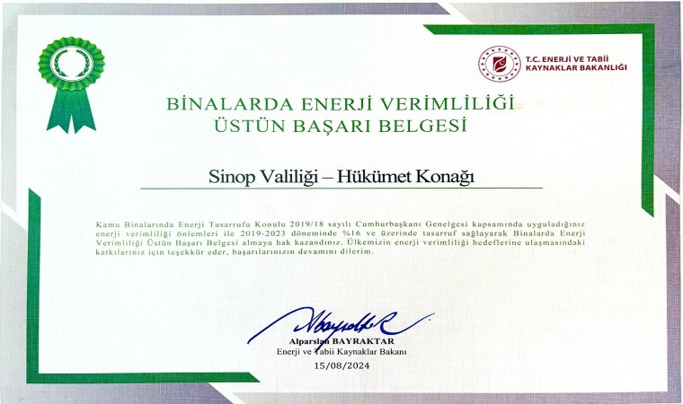 15 Ağustos 2019 tarihli ve 2019/18 sayılı Cumhurbaşkanlığı Genelgesi ile kamu kaynaklarının etkin kullanılması kapsamında Sinop Valiliği tarafından gerçekleştirilen enerji verimliliğine yönelik çalışmalar neticesinde Sinop Valiliği Hükümet Konağı’nda yüzde 16 ve üzerinde enerji tasarrufu sağlandı. Enerji ve Tabii Kaynaklar Bakanı Alparslan Bayraktar’ın takdirleri ile Sinop Valiliği, "Binalarda Enerji Verimliliği Üstün Başarı Belgesi" ile ödüllendirildi.