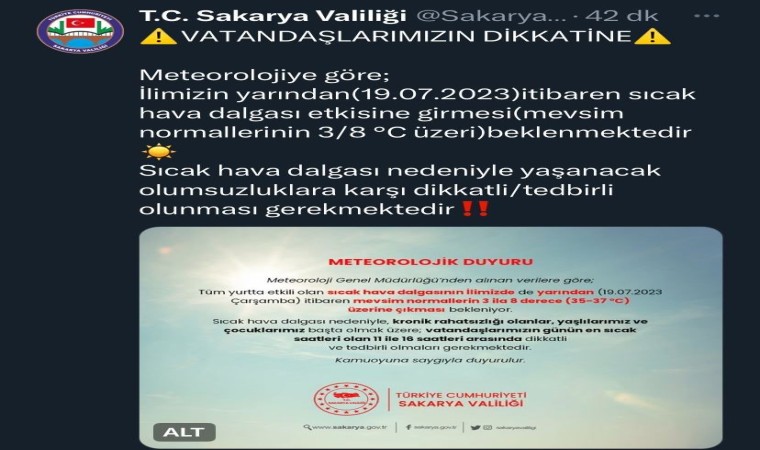 Meteoroloji Genel Müdürlüğü’nden alınan verilere göre, 19 Temmuz Çarşamba günü itibari ile Sakarya’da hava sıcaklıkları mevsim normallerinin 3 ila 8 derece üzerinde olması bekleniyor. Sakarya Valiliği tarafından vatandaşlara yapılan uyarıda, 37 dereceye çıkması beklenen sıcak havada yaşanabilecek olumsuzluklara karşı dikkatli ve tedbirli olunması gerektiği belirtildi.
