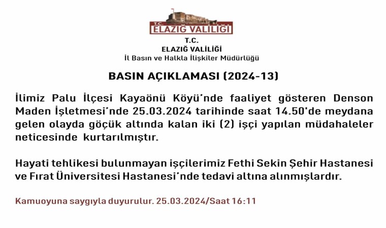 Valilik tarafından yapılan açıklamada, “İlimiz Palu ilçesi Kayaönü köyünde faaliyet gösteren Denson Maden İşletmesinde 25 Mart 2024 tarihinde saat 14.50’de meydana gelen olayda göçük altında kalan iki işçi yapılan müdahaleler neticesinde kurtarılmıştır. Hayati tehlikesi bulunmayan işçilerimiz Fethi Sekin Şehir Hastanesi ve Fırat Üniversitesi Hastanesinde tedavi altına alınmıştır’’ denildi.