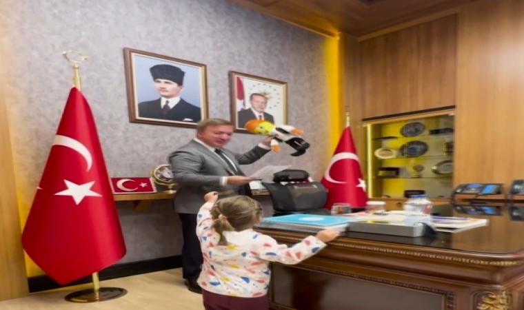 A 4 kağıdına çizdiği deniz kızı resmini Vali Aydoğdu’ya hediye eden minik Elif’in şirinliği gözden kaçmadı. Resmi alıp duvara asan Vali Aydoğdu, Elif’e oyuncak bebek hediye etti.