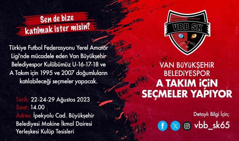 Türkiye Futbol Federasyonu Yerel Amatör Ligi’nde mücadele eden Van Büyükşehir Belediyespor, A Takım ve alt yapı takımları için seçmeler yapacak.