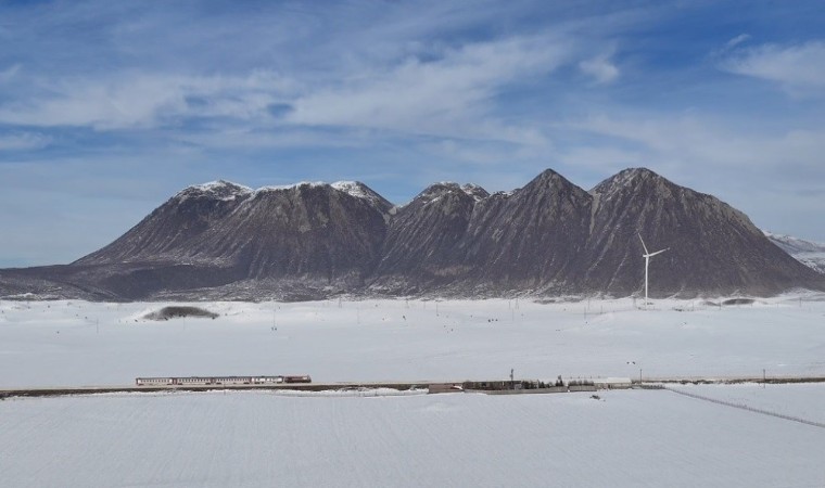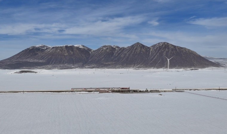 Trenin geçişi sırasında alınan görüntüler, Kirkor Dağı’nın görkemi eşliğinde karla kaplı düzlüklerden geçen trenin huzur dolu yolculuğu gözler önüne seriliyor.