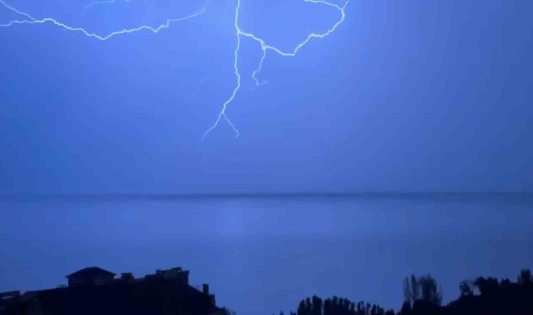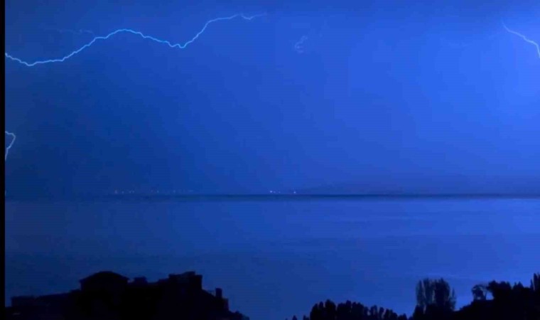 Bitlis’in Ahlat ilçesinde etkili olan gök gürültülü sağanak yağışla birlikte Van Gölü’ne düşen şimşekler adeta geceyi gündüze çevirdi. Meteorolojinin uyarısı sonrası Bitlis il merkezi ve ilçelerinde gök gürültülü sağanak yağış etkili oldu. Yağmur ile birlikte Van Gölü üzerinde art arda çakan şimşekler geceyi aydınlattı. Şimşek görüntüleri hem korkuttu hem kartpostallık görüntüsüyle hayran bıraktı. Van Gölü kıyı şeridinde evleri bulunan vatandaşlar Van Gölü’ne düşen şimşekleri hem izleme keyfi yaşadı hem de oluşan görsel şöleni telefonlarıyla kaydetmeye çalıştı. Öte yandan meteorolojiden yapılan açıklamaya göre gök gürültülü sağanak yağışların salı gününe kadar devam etmesi bekleniyor.