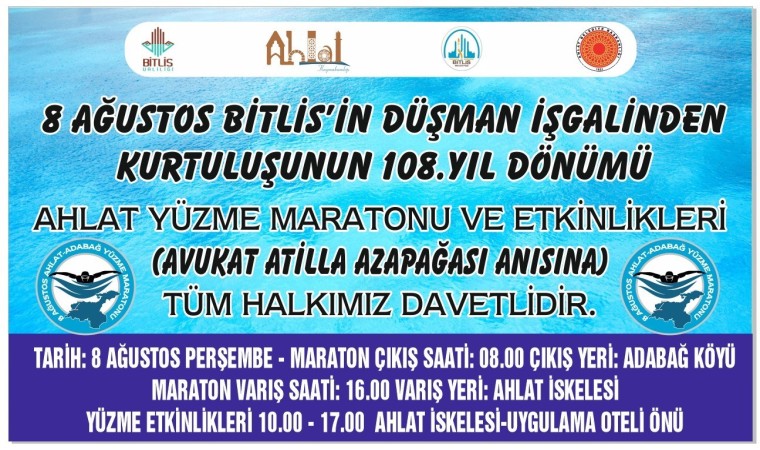 8 Ağustos’ta kutlanacak Bitlis’in düşman işgalinden kurtuluşunun 108. yıldönümü programı kapsamında, Tatvan ilçesine bağlı Adabağ köyü ile Ahlat ilçesi arasında ilk defa 14 kilometrelik yüzme maratonu düzenlenecek. Bu yıl ilki düzenlenecek yüzme maratonu geçtiğimiz aylarda hayatını kaybeden Ahlatlı avukat Atilla Azapağası anısına yapılacak.