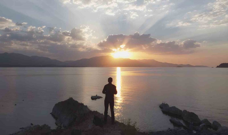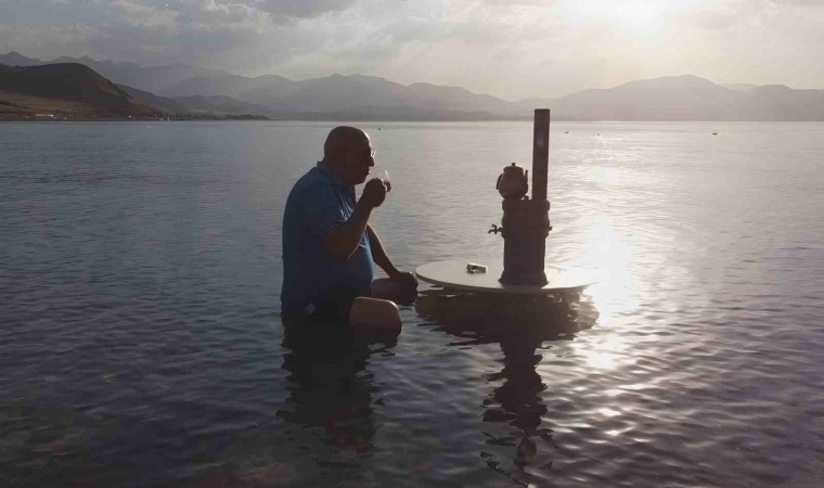 Dünyanın en büyük sodalı gölü olan Van Gölü’nde günbatımına karşı semaver çayı içen vatandaşların görüntüsü mest etti.