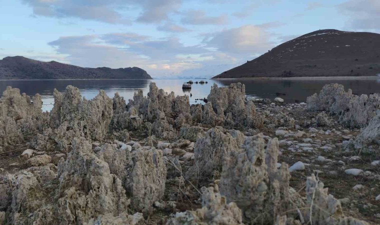 Van Gölü’nde küresel ısınmaya bağlı yaşanan su seviyesindeki düşüş devam ederken, su yüzeyine çıkan mikrobiyalitler balıkçıların ağ ve tekneleri için tehlike oluşturuyor.