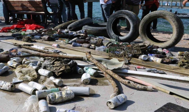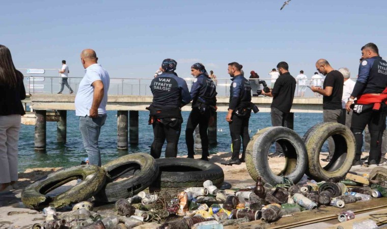 Van İtfaiye Daire Başkanlığı’na bağlı Sualtı Arama Kurtarma ekiplerinin kirliliğe dikkat çekmek için dalış yaptıkları Van Gölü’nde araç lastiğinden mangal şişine, cep telefonundan protez dişe kadar yüzlerce atık çıkardı.