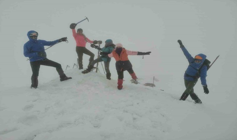 Kınıközü köyünde bir araya gelen dağcılar, karla kaplı 3 bin 50 rakımlı Berit Dağı’na tırmanış yaptı. Zirveye ulaşan dağcılar, fotoğraf çektikten sonra ‘Van Gölü kirlemesin, mavi kalsın’ pankartını açtı.