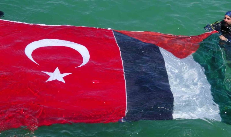 Sualtı Arama Kurtarma Eğitim Derneği (AKEM) üyeleri, Filistin’e destek olmak ve saldırıları kınamak amacıyla Van Gölü’nün yüzeyinde Türk ve Filistin bayrağı açtı.