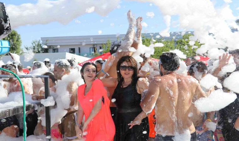 Yaz tatilini Van’da geçiren İranlılar, Akdeniz sahillerini aratmayan köpük partisiyle serinliyor.