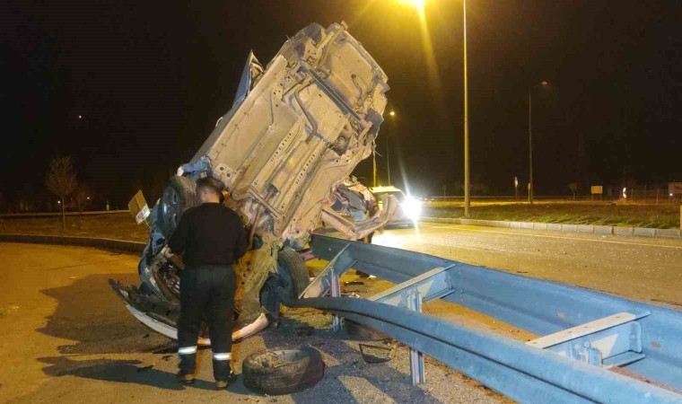 Van-Erciş karayolunda bariyerlere çarpan otomobil dik şekilde asılı kaldı. Kazada 3 kişi yaralandı.