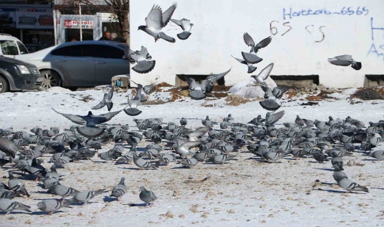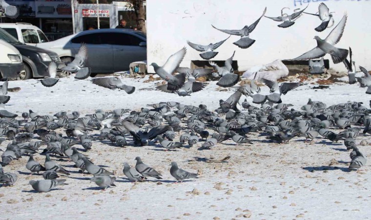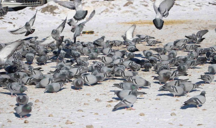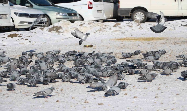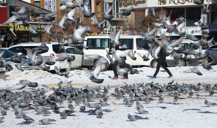 Van’daki Ahmed-i Hani Kültür Parkı çevresindeki binaların çatı katlarını barınak edinen binlerce güvercin, kar yağışı sonrası atılan yeme akın ederek görsel şölen sunuyor.