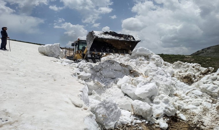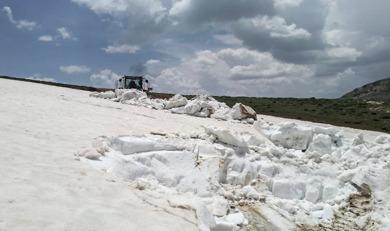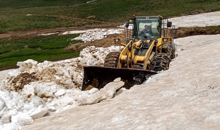 Van Büyükşehir Belediyesi, haziran ayının son günlerinde Gürpınar ilçesindeki 3 bin rakımlı Sıcaksu Mahallesi Tüzek mezrasında tarımsal arazi ve yayla yolunda karla mücadele çalışması yürütüyor.