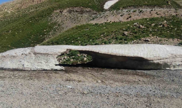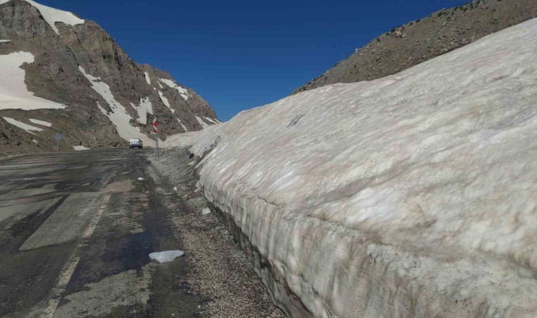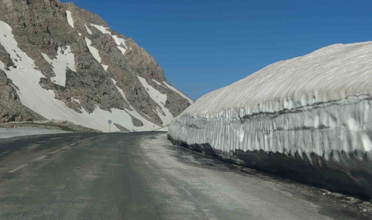 Van’da yaz mevsimi kendini iyiden iyiye hissettirirken, Van-Bahçesaray karayolu üzerindeki 3 bin rakımlı Karabet Geçidi’nde ise insan boyunu aşan kar kütleleri kış manzarası oluşturuyor.