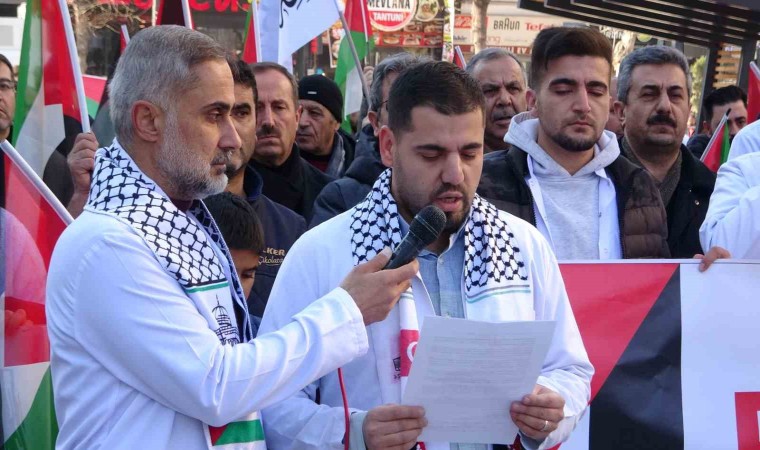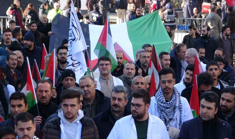 Burada grup adına açıklamalarda bulunan Dr. Yakup Aslan, Gazze’deki katliamların hız kesmeden devam ettiğini belirtti. Kudüs davasının yalnız Filistinlilerin olmadığını her Müslüman’ın derdi olması gerektiğini ifade eden Dr. Aslan, “Sözde İsrail devletinin bayrağındaki iki mavi çizgi, Fırat ve Nil nehirlerini temsil etmekte, bu iki nehir arasındaki topraklar da kurulacak büyük bir devletin hayali ile yaşamaktadırlar. Buradan belirtiyoruz ki Fırat ve Nil zalimlere ve işgalcilere, boğuldukları mezardan başka bir şey olmayacaktır. Bugün de hekimler ve sağlık çalışanları olarak soykırım, işgal ve teröre karşı yürüyüşümüzü 7. haftasında yaklaşık 40 ilde tek yürek olarak gerçekleştiriyoruz. Gündemden düşürülmeye çalışılsa da, kimileri için sıradan hâle gelse de Gazze’de ambargo ve katliamlar hız kesmeden devam ediyor. Bizler de ilk günkü öfke ve acı ile sözün tükendiği yerde, sessiz yürüyüşümüz ile farkındalık oluşturmaya devam ediyoruz. İsrail, 7 Ekim’den bu yana onlarca doktoru tutukladı, onlarcasının ise nerede olduğu hâlâ bilinmiyor” dedi.