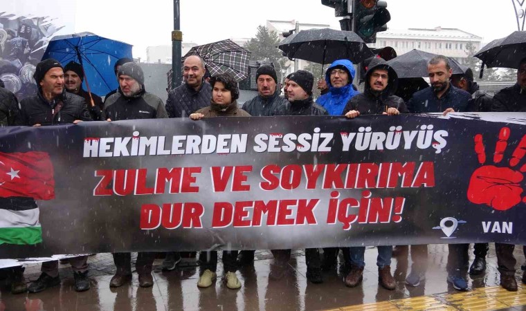 Van’da görev yapan sağlık çalışanlarının, Filistin’e yapılan saldırılara dikkat çekmek amacıyla başlattıkları ’sessiz protesto’ bu hafta da yoğun kar yağışı altında devam etti.