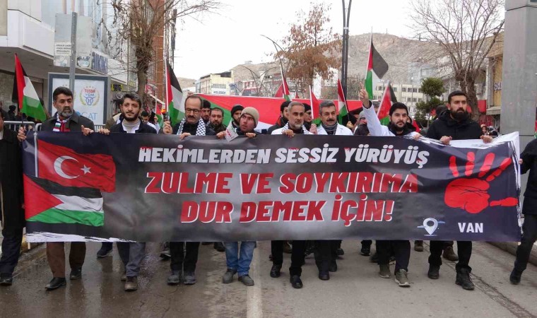 Van’da görev yapan sağlık çalışanları, Filistin’e yapılan saldırılara dikkat çekmek amacıyla başlattıkları sessiz yürüyüşlerine bu hafta da devam etti.